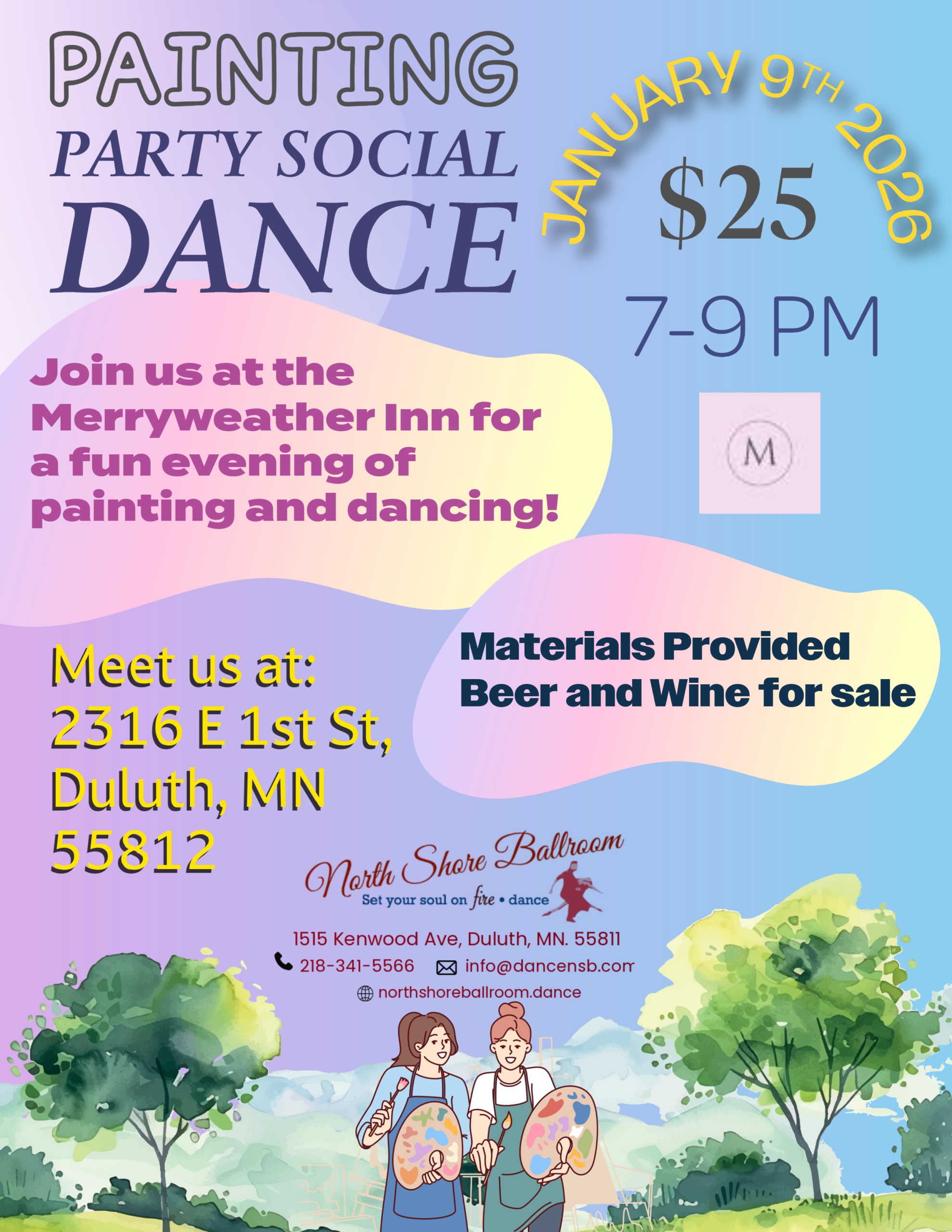 Join North Shore Ballroom at the historic Merryweather Inn for an evening of Bob Ross painting and social dancing! Includes painting supplies and the social dance! There will be wine and beer for sale.